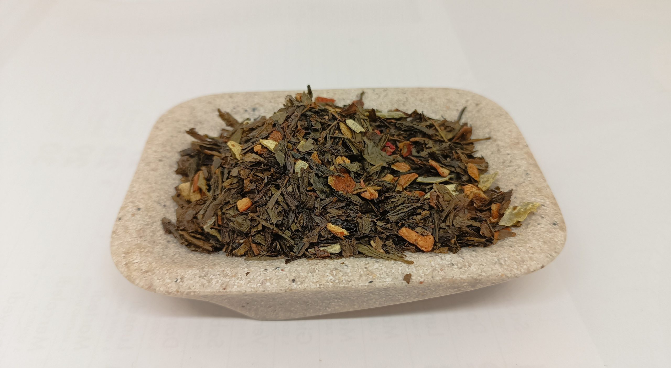 Tè verde sencha speziato dall'intenso aroma di cannella ed arancia. Con pezzettini di cocco e mandorle, scorze d'arancia, petali di rosa.